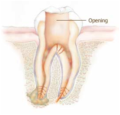 If it is painful, the dentist may numb the tooth. An opening is made through the crown of the tooth to the pulp chamber.