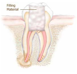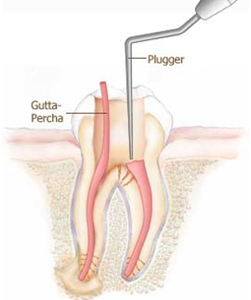 The canals are filled with a permanent inert rubber material called gutta-percha cones. This helps to keep the canals free of infection or contamination & fills the dead space.